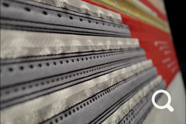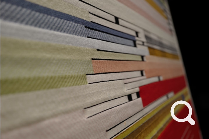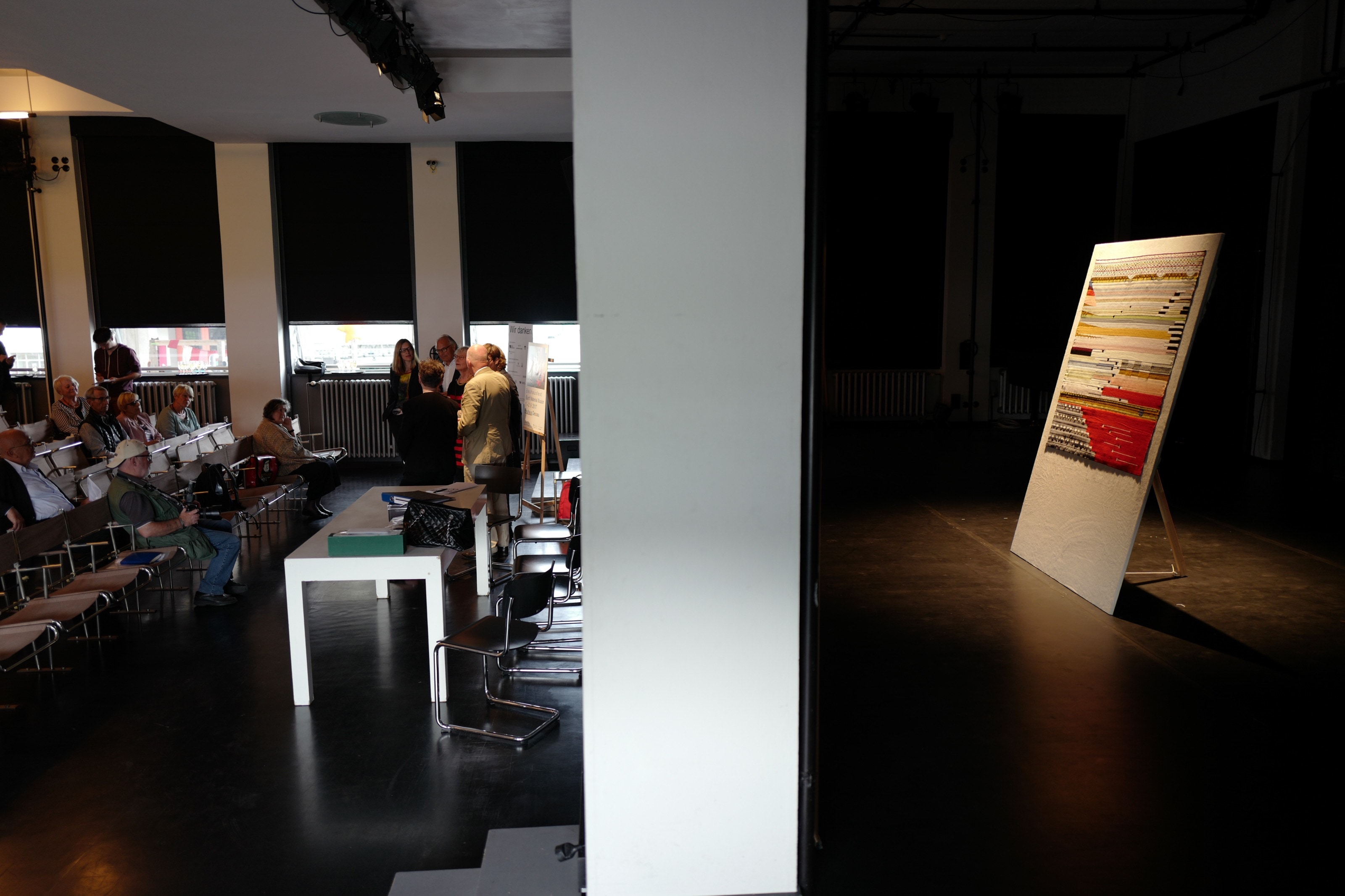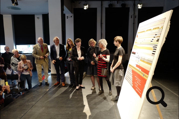im bild zu sehen ist ein aktuelles exponat der ausstellung, die replik eines wandbehangs von textildesignerin katharina jebsen in zusammenarbeit mit der kunsthochschule burg giebichenstein, nach einem entwurf der ersten bauhaus-meisterin gunta stölzl.